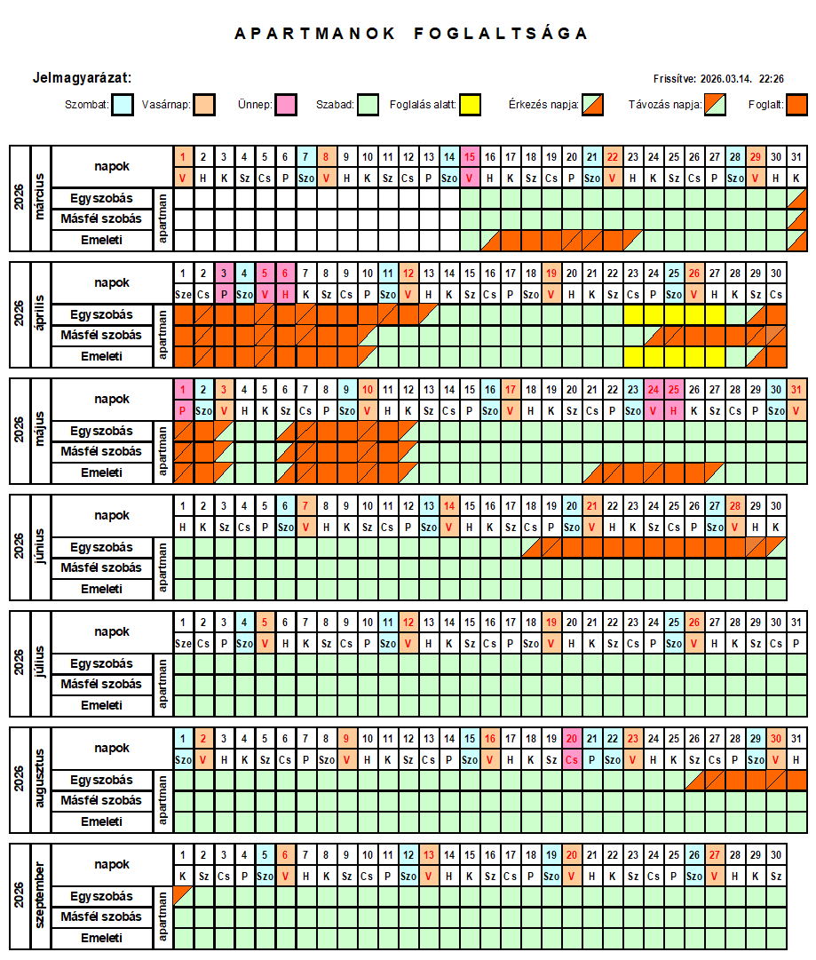 Foglalási információ: 2026. januárban egyidejűleg legalább két apartman foglalható. Minimális foglalási idő 2 éjszaka. Augusztus 19. és 24. közötti időszakban legalább 3 éjszakára lehet foglalni apartmant vagy a vendégházat.